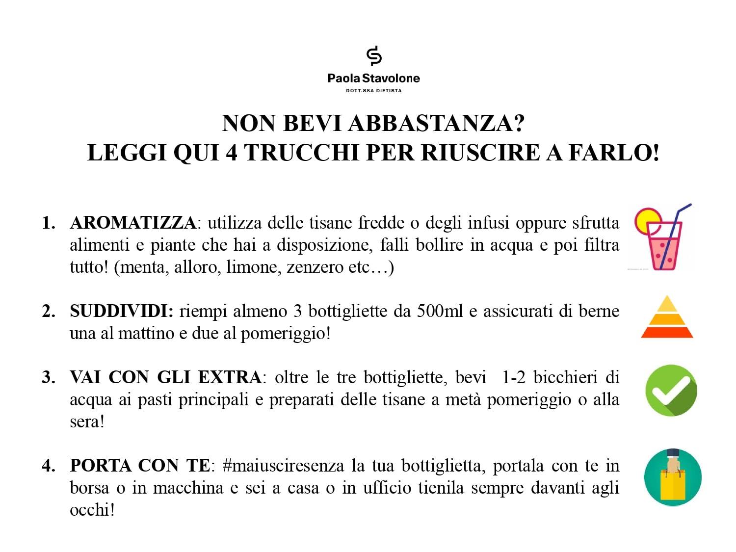 Ecco allora che ho deciso di proporre alcune strategie che possono aiutare a soddisfare il giusto apporto di acqua giornaliero, strategie molto semplici e alla portata di tutti!