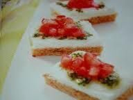 Ingredienti Per 4 persone: 8 fette di pane morbido ai cereali, 3 pomodori maturi 8 cucchiai di pesto al basilico 300 gr di mozzarella di bufala una presa di sale Preparazion