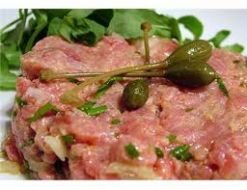 Ingredienti Per 1 porzione: 150 gr di filetto di manzo tritato, un uovo, uno scalogno, 10 gr di capperi sotto sale, 20 gr di cipolline in agrodolce, senape, tabasco, sale e pepe. P