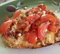 Ingredienti Per 4 persone: 4 fette di pane casereccio, 8 fettine di magatello di vitello, 2 pomodori, origano, basilico, aglio, 1/2 bicchiere di vino bianco, olio extravergine di o