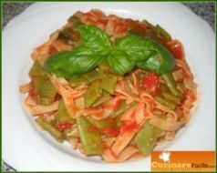 Ingredienti Per 4 persone: -500 gr di fagiolini tipo taccole -300 gr di tagliatelle sottili -una decina di pomodori maturi -un mazzetto di basilico fresco -2 spicchi d’aglio