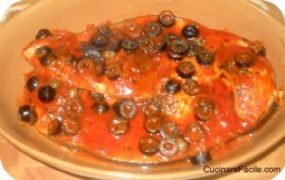 Ingredienti 2 larghe fette di smeriglio una cipolla 300 ml di passata di pomodoro 5 cucchiai di olio extravergine d’oliva un pizzico di sale 100 gr di olive nere denocciolate