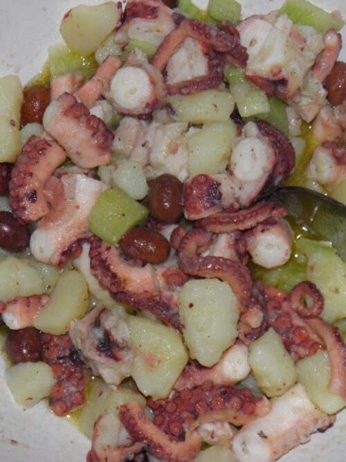 Ingredienti Ingredienti per 4 persone: -2 piovre ciascuna del peso di circa 700 g -una carota -una cipolla -una gamba di sedano -una foglia di alloro -1 rametto di timo -1 dl di ac