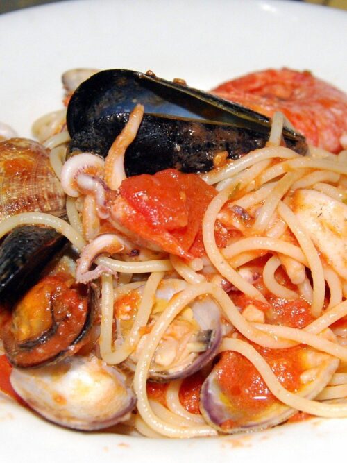 Ingredienti Dosi per 4 persone: 240 g di bavette, 800 g di molluschi misti (calamari, polipetti, seppie), 400 g di polpa di pomodoro, vino bianco secco, 1 piccolo cuore di sedano,