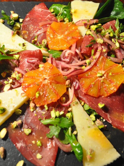 Ingredienti Dosi per 4: 1 piccolo cespo di lattuga, 1 pompelmo, 1 pompelmo rosa, 1 arancia, 80 g di bresaola affettata fine, 1 cucchiaio di olive nere, 1 mazzetto di basilico, fogl