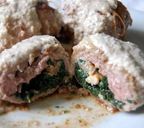 Fagottini di vitello ripieni di spinaci con salsa di noci