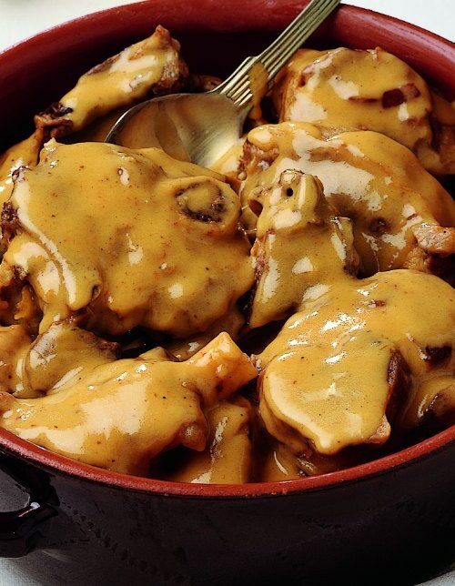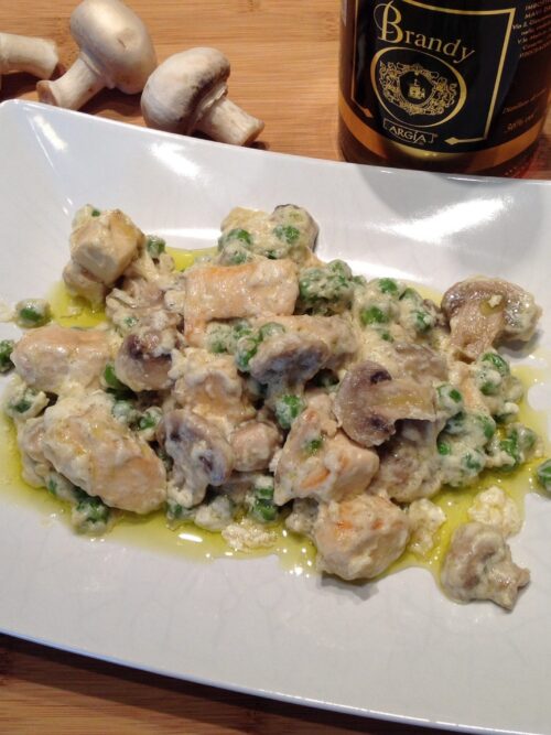 I bocconcini di pollo al brandy con panna, funghi e piselli costruiscono un secondo piatto corposo, saporito e profumato. La carne del pollo si arricchisce del sapore particolare d