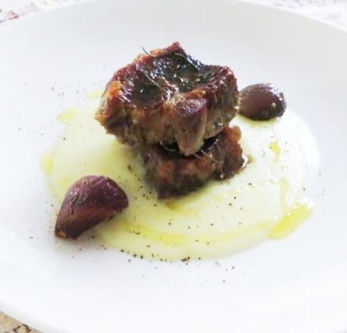 Il capocollo, cipolline e crema di patate è un secondo piatto di carne saporito e succulento che sfrutta la parte del maiale tra la testa e il lombo in modo sublime. Il gras