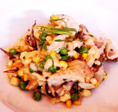 Coniglio con pancetta e piselli